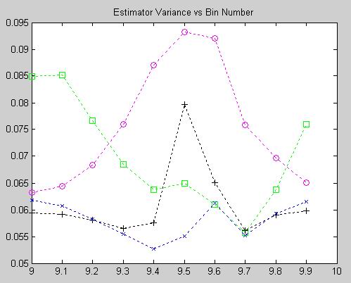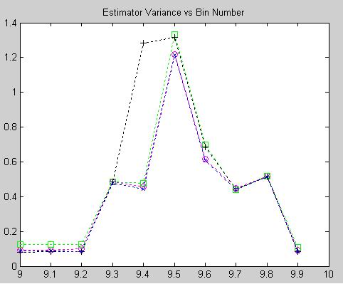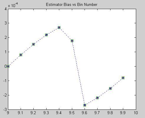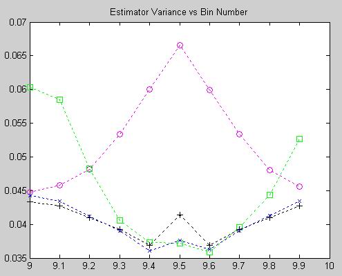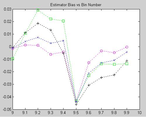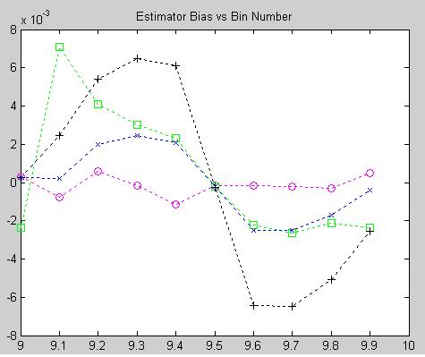 The above show the variance, (actually RMSE) and bias performance of each estimator with no added noise. In this case the estimators are indistinguishable and seem to exhibit consistent variance and bias performance. This seems a little odd on the surface and without further investigation speculate that there may be simulation artifacts that drive this joint performance behavior. In any case the relative performances are inseparable in this simulation.