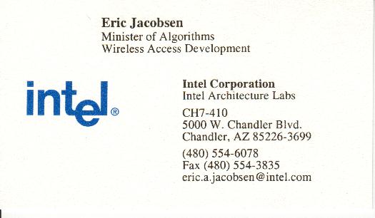 I started using the title "Minister of Algorithms" around 1992 while I was working at EFData. At the time the engineering department at EFData didn't have "real" titles, and I was corresponding with a subcontractor and figured I needed to put a title in the salutation, so I made this one up. It got back to some of the other folks in the department and started to stick. One of my conditions for taking employment at Intel was that I could keep this title, which I did.